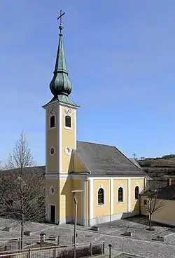 Die schlichte josephinische Saalkirche mit Satteldach steht etwas erhöht über einer Futtermauer in der Ortsmitte im Keil von zwei sich verbindenden Durchgangsstraßen. Das Langhaus ist durch Rundbogenfenster und Putzbänder gegliedert. Der vorgestellte schlanke Nordturm trägt einen Zwiebelspitzhelm. Der eingezogene rundbogig geschlossene Südchor wird von Neubauten, einem Pfarrzentrum und einer Aufbahrungshalle, flankiert. Das dreijochige Langhaus hat einen einjochigen Chor mit einem korbbogigen Schluss. Das queroblongen Platzlgewölbe über Doppelgurten und Doppellisenen ruht auf trapezförmigen Wandpfeilern.