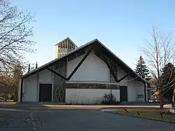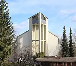 Die Kirche ist ein 1967 nach Plänen von Walter Pinzer errichteter Bau mit trapezförmigem Grundriss unter einem vorgezogenen Satteldach. Im Westen ist ein Chorturm mit einem offenen Glockengeschoß angestellt.