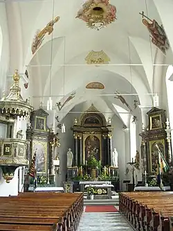 Der gotische und barockisierte Kirchenbau, von einem ummauerten Friedhof umgeben, steht in einem reizvollen Bauensemble.
