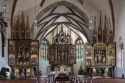 Im Inneren der Kirche befinden sich drei bemerkenswerte spätgotische Flügelaltäre aus den Jahren 1517–1523 aus der Werkstatt Lienhard Krapfenbachers im Stil der Donauschule. Die Arbeiten sind künstlerisch wertvoll, da sie ein schönes Beispiel besten Volkstums sind. Das bemerkenswerte Chorgestühl stammt aus dem Jahr 1522.[3] An der Nordwand des Chores steht eine lebensgroße Statue des heiligen Florian von Lorch, die 1709 in Freistadt um 39 Gulden gekauft wurde.[3] An der Südseite steht die Status des heiligen Leonhard von Limoges, die 1756 erworben worden sein soll.[3]