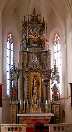 Das Langhaus der Kirche ist blockhaft und weist ein hohes Satteldach über einem gekehlten Traufgesims auf. Das Langhaus wird durch hohe, dreibahnige Maßwerkfenster sowie eine steinerne gekehlte Sockelleiste gegliedert. An den Westseiten ist je ein übereck gestellter Strebepfeiler und an den Langhausseiten befindet sich je ein zugemauertes Gewändeportal mit halbkreisförmig aufgebogenem, profiliertem Sturzbalken mit seitlichen Vasen. Der einjochige Chor ist eingezogen und schließt im 5/8-Schluss. Im Polygon ist er durch Strebepfeiler sowie durch zweibahnige Maßwerkfenster gegliedert. Nördlich des Chores befindet sich ein hochgotischer Kapellenanbau mit nördlich ausgerichteten Strebepfeilern und späteren rundbogigen Fenstern vom Ende des 17. Jahrhunderts. Ein ostseitig liegendes Schlitzfenster wurde später abgemauert und weist heute noch Farbreste aus dem 14. Jahrhundert am Gewände auf.