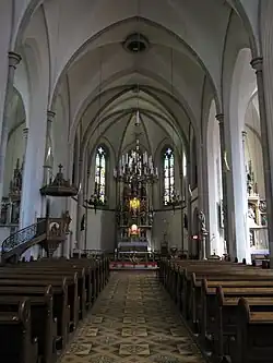Im Chorraum hängen beiderseits große vielkerzige Kronleuchter.