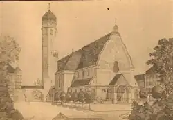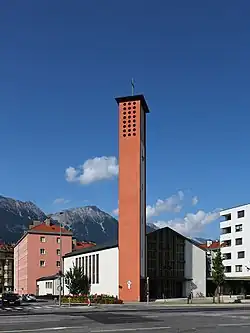 Nach dem Zweiten Weltkrieg wurde 1946 die Notkirche wieder eröffnet und neue Pläne für einen Kirchenneubau entwickelt. Da das ursprünglich vorgesehene Grundstück inzwischen verbaut war, fand man einen Bauplatz an der Ecke Egger-Lienz-Straße/Fritz-Pregl-Straße neben dem Westfriedhof, wo 1949 ein provisorisches Pfarr- und Jugendheim in Form einer einstöckige Baracke errichtet wurde. Baurat Hermann Jung und Architekt Hans Flür erstellten einen ersten Entwurf für die Kirche, der nach Überarbeitung von Martin Eichberger umgesetzt wurde. Am 4. September 1955 erfolgte der erste Spatenstich und am 16. Oktober 1955 die feierliche Grundsteinlegung durch Bischof Paulus Rusch.[5] Bereits im Dezember 1955 konnte die Firstfeier begangen werden, am 13. Oktober 1957 wurde die Kirche geweiht. 1959 wurde das Pfarrhaus errichtet.[6]