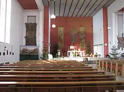 Der langgestreckte, hohe Innenraum wird durch die seitlichen Fenster und die verglaste Eingangswand belichtet. Die Dach- und Deckengestaltung im Langhaus deuten eine Dreischiffigkeit an. Der überhöhte Chorraum ist mit einer Flachdecke versehen.[7] An der Hochaltarwand befindet sich eine monumentale Bronzeskulptur des Auferstandenen, die 1968 von Ilse Glaninger-Balzar geschaffen wurde. Auch die beiden Seitenaltäre, der Familien-Altar (1974) und der Taufaltar (1976), wurden von der Künstlerin gestaltet.[8]