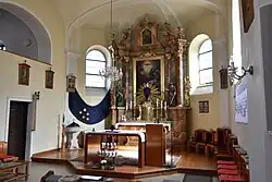 Das kurze, zweigeschoßige Turmjoch ist unten breit tonnengewölbt. Oben ist eine Holzbalkendecke. Über zwei quadratischen Schiffsjochen ist ein flaches Gewölbe#Kreuzgratgewölbe zwischen Gurtbögen. Die Wand ist durch gestufte Pilaster gegliedert. Über dem quadratischen Chorjoch ist Platzlgewölbe. Über der Apsis sind Kappen zwischen Gurten. In der Sakristei ist Tonnengewölbe mit Stichkappen. An der ehemals freistehenden Südwand ist eine Stuckkartusche mit der Jahreszahl 1797.