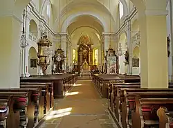 Das Kirchenäußere zeigt eine mächtige barocke basilikale Emporenkirche mit einer im 19. Jahrhundert ausgebauten Giebelfront als Doppelturmfassade. Der Chor ist im Kern gotisch. Die Kirche war eine Wehrkirche und ist von einer ehemaligen wehrhaften Kirchhofmauer umgeben.