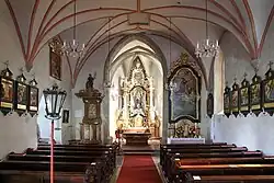 Das Kircheninnere zeigt einen dreijochigen Saalraum mit einem Putzrippengewölbe mit rechteckigen Blend-Scheitelfeldern, einer Halbkreistonne, diagonale Streifenpaare, Kuppen und Konsolen aus dem Anfang des 16. Jahrhunderts. Die gemauerte Orgelempore ist korbbogenunterwölbt. Der Triumphbogen ist spitzbogig. Der einjochige Chor mit einem Fünfachtelschluss hat ein Kreuzrippengewölbe auf Einzeldiensten mit profilierten Kapitellen und Schlusssteinen. In der Chorsüdwand befindet sich eine flachbogige Sitznische und eine Eisenplattentür zur Sakristei, in der Chornordwand gibt es ein Schulterportal in einem spitzbogigen Feld zur Turmtreppe. Im nordöstlichen Langhaus befindet sich eine breite Spitzbogenöffnung mit einer barocken Seitenkapelle mit einem Stichkappengewölbe und im Schluss mit drei Stichkappen mit stuckierten Köpfen an den Gewölbeansätzen. Es gibt ein barockes Marmor-Lavabo mit einem wasserspeienden Löwenkopf und gesprengtem Volutenaufsatz mit der Inschrift Pfarrer Georg Weh von St. Andrä 1679.