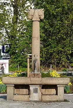 Der Brunnen aus Beton und Kunststein hat die Form einer Pferdetränke mit einer von zwei Pferdeköpfen bekrönten Mittelsäule. Die Köpfe werden durch eine Kumt-artige Form zusammengehalten.[5] Am Fuß des Brunnens befinden sich zwei Hundetränken. Der Brunnen trägt die Inschrift „Errichtet vom alten Tierschutzverein 1921“.