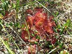 Der seltene Rundblättrige Sonnentau (Foto) findet in den dauernassen Gebieten mit nährstoffarmen Boden Siedlungsgemeinschaft mit den Torfmoosen.[2]