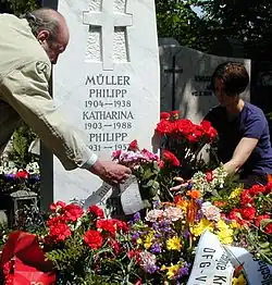 Zu Müllers Begräbnis in München kamen rund 3000 Menschen. In der DDR wurde das Andenken an ihn insbesondere durch die FDJ zur Propaganda genutzt.[2] Philipp Müller wurde dazu als „deutscher Patriot“ und „Nationalheld“ bezeichnet.[3] Der damalige 1. Vorsitzende der FDJ, Erich Honecker, erklärte auf einer Kundgebung am 16. Mai 1952 in Berlin, die deutsche Jugend werde „nicht eher rasten und ruhen […] bis der Mord an Philipp Müller durch den Sturz der verräterischen Adenauerclique gesühnt ist.“[4]