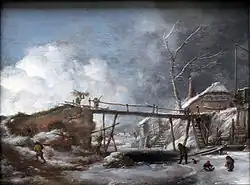 - Winterlandschaft mit Holzsteg, Holz, 28,5 × 36,5 cm, Berlin, Staatliche Museen, Gemäldegalerie