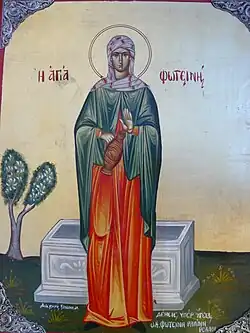 Die Samariterin wurde von den Jüngern auf den Namen Photina getauft. Sie bekehrte ihre fünf Schwestern Anatole, Photo, Photis, Paraskeve und Kyriake und ihre beiden Söhne Joseph und Viktor zum Christentum. Nach dem Martyrium von Petrus und Paulus zog sie mit ihren Schwestern und ihrem Sohn Joseph nach Karthago, um dort die Lehren Christi zu verbreiten. Sie soll dort unter Kaiser Nero als Märtyrerin gestorben sein.[2]