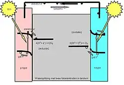 In diesem Typ von photoelektrochemischer Zelle wird Wasser in einer Elektrolyse in Wasserstoff und Sauerstoff zerlegt, wenn die Anode mit Licht bestrahlt wird. Dadurch kann Wasserstoff mit einem Wirkungsgrad von rund 10 % gewonnen werden.