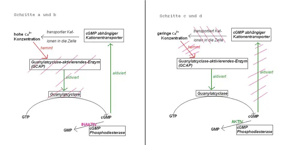 - Die aktive PDE spaltet nun cGMP in GMP. Der sinkende cGMP-Spiegel hemmt den Kationen-Einstrom in die Zelle. Die sinkende Ca2+-Konzentration aktiviert nun das Guanylylzyklase-aktivierende Enzym, das seinerseits die Guanylylzyklase aktiviert. Dadurch wird nun auch cGMP wieder aufgebaut, es stellt sich also ein Gleichgewicht zwischen Auf- und Abbau ein.