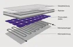 PVT-Kollektoren bestehen aus einem PV-Modul und einem Rohrregister, in dem sich ein Wärmeträger befindet. Das Rohrregister besteht aus Metall (meist Kupfer oder Aluminium) oder Kunststoff und ist mit dem PV-Modul entweder verklebt, laminiert oder in den Rahmen eingeklemmt, um einen guten thermischen Kontakt zum PV-Modul herzustellen.
