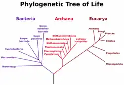 1990 wurde von Carl Woese et al. der 3-Domänen-Stammbaum des Lebens vorgestellt (siehe Abb.), der erstmals auf molekular-phylogenetischen Analysen (rRNA-Sequenzvergleichen) basiert.[1] Zwei der drei Lebenslinien (Domänen) bestehen ausschließlich aus Mikroorganismen. Dieses Stammbaumkonzept wurde von Jan Sapp als "The New Foundations of Evolution" bezeichnet.[2] Es wurde seither häufig übernommen und modifiziert.