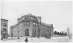 Beim Bau des Gebäudes 1906 kam es zu Behinderungen, da sich herausstellte, dass das alte Bett des Kettenhofbaches unter dem geplanten Gebäude lag.[40] Aus diesem Grund konnte kein Grundstein gelegt werden, stattdessen wurde am 13. Mai 1906 im Dachgeschoss ein Schlussstein gesetzt.[41] Finanziert wurde das Gebäude hauptsächlich durch Spenden, die Baukosten betrugen mehr als 1,5 Millionen Mark.[41] Treibende Kräfte beim Neubau des Gebäudes waren Eugen Hartmann und Leo Gans, die beide Vorstandsmitglieder waren und selbst namhafte Geldbeträge spendeten.[42]