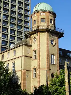 Am 28. Oktober 1951 wurde das Richtfest für den Wiederaufbau gefeiert.[57] Auf das Gebäude, das im Geschmack der Zeit und aus Kostengründen einfach gehalten war, setzte man eine weitere Etage.[58] Damit entfielen die Plattform auf dem Dach und ihre Einrichtungen. Ende 1954 waren die finanziellen Mittel des Vereins erschöpft. Die Bauarbeiten gingen erst im Frühjahr 1955 weiter, nachdem ein weiterer Kredit bewilligt worden war. Der große Hörsaal feierte am 28. Mai 1956 Einweihung. Erst 1960 war auch die im März 1945 komplett ausgebrannte Sternwarte einsatzbereit.