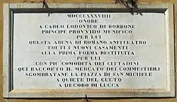 Im späten 1. oder frühen 2. Jahrhundert errichteten die Römer ein Amphitheater außerhalb ihrer ummauerten Siedlung Colonia Luca. Die Stadtmauer existierte seit ca. 180 v. Chr., das römische Forum lebt heute noch mit der Piazza San Michele und der nach dem zentralen Platz benannten Kirche San Michele in Foro weiter. Über 55 auf Pfeilern ruhenden Bögen gab es eine weitere Reihe von versetzt dazu angeordneten Bögen. Sie stützten die Cavea, die ihrerseits aus 20 Stufen bestand und etwa 10.000 Zuschauern Platz bot.[2] In diesem eher kleinen Amphitheater wurden Pferderennen und Gladiatorenkämpfe ausgetragen. An den Außenmauern des Platzes ist die Struktur des antiken Bauwerks teilweise noch erkennbar.