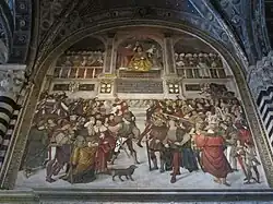 Francesco (* 1439 in Siena oder Sarteano – † 1503 in Rom). Von den ersten Jahren an erfolgte seine Ausbildung von seinem Onkel mit besonderer Aufmerksamkeit. Auf seinen Reisen durch Europa nahm er seinen jungen Neffen mit, der bereits im Alter von vierzehn Jahren die Universität Wien besuchte.Krönung Pius III. Er setzte sein humanistisches und juristisches Studium in Ferrara und Rom bei erstklassigen Lehrern wie Giacomo Tolomei und Andrea Benzi fort, bevor er in Perugia promovierte[4]. Unmittelbar nach der Besteigung des päpstlichen Throns durch seinen Onkel im Jahr 1460, wurde er im Alter von 23 Jahren, als er bereits Verwalter der erzbischöflichen Diözese Siena war, zum Kardinal ernannt und begann seine kirchliche Laufbahn als Diakon[5], da er nicht zum Priester geweiht war. Später wurde er mit zahlreichen Präpositiuren und Diakonaten im In- und Ausland betraut, mit der anschließenden Ernennung zum päpstlichen Gesandten in der Mark von Ancona[5]. In diesen Jahren lebte er fast immer in Rom, wo er einen Palast erworben hatte, der zu einem prächtigen Sitz mit einer reichen Bibliothek wurde und mit verschiedenen Kunstwerken, insbesondere einer reichen Sammlung alter Statuen, ausgestattet war[4]. Als sein Onkel 1464 Rom verließ, um sich auf den Kreuzzug gegen die Türken vorzubereiten, wurde er zum Generalvikar „in temporalibus“ ernannt, zuerst in Rom und dann im ganzen Kirchenstaat[4]. All diese Vorrechte gaben einen Einblick in eine sorgfältige Vorbereitung auf eine wahrscheinliche Nachfolge von Francesco auf den Papstthron seines Onkels. Der plötzliche und vorzeitige Tod von Pius II. überraschte den Kardinal und die Partei der piesco. Die von seinem Onkel praktizierte nepotistische Politik und Simonie hatten in der Kurie für viel Unzufriedenheit gesorgt. Tatsächlich verlor Francesco nach der Wahl des neuen Papstes die Macht und wurde in seine Heimatstadt verbannt[4].Piccolomini-Bibliothek im Dom von Siena Sein Ruhm als aufrechter Mann, seine juristische und kirchliche Bildung und seine feine Diplomatie ermöglichten es ihm, allmählich wieder ins Spiel zu kommen und ihm eine führende Position in der Schlichtung der religiösen Schismen zu verschaffen, die Mitteleuropa erschütterten. Seine guten Kenntnisse der deutschen Sprache und der Probleme spielten eine führende Rolle bei der Erzielung unbestreitbarer Erfolge. Nach dem Tod von Pius II. bestiegen in den folgenden vierzig Jahren vier Papste den Thron von St. Peter, und bei jedem Konklave zählte der sienesischen Kardinal zu den in Frage kommenden Kandidaten. Er konnte die zahlreichen Fallstricke überwinden, die die kapitolinischen Fraktionen erschütterten, die einerseits von den Spaniern und andererseits von den Franzosen unterstützt wurden. Letzteres gefiel ihm nicht und er sympathisierte immer mit den spanischen Herrschern und der aragonesischen Dynastie des Königreichs Neapel. In Anbetracht seiner nachgewiesenen Richtigkeit wurde er 1503 trotz der Unstimmigkeiten und nach einer Zeit heftiger Turbulenzen zum Papst mit dem Namen Pius III. gewählt. Sein prekärer Gesundheitszustand begünstigte seine Ernennung in Erwartung eines Übergangspontifikats[4], das zwar unerwartet nur wenige Tage dauerte. Er hatte einen Ruf als sanfter und frommer Mann und war für seine Ehrlichkeit und seiner Liebe zur Kunst, frei von nepotistischen Versuchungen und Simonien bekannt[5]. In den letzten Jahren begann er mit dem Bau der Piccolomini-Bibliothek, die von Pinturicchio mit Fresken versehen wurde[6], wo er neben den wichtigen Kodizes, die von seinem Onkel geerbt wurden, auch seine wichtige Bibliothek aufbewahrt hatte, der später weitere hinzugefügt wurden. Dank seiner Intervention erhielt der Dom von Siena den von Andrea Bregno gebauten Piccolomini-Altar der mit Statuten des jungen Michelangelo[7] ausgestaltet wurde. Weitere Auftragswerke aus Siena, Pienza und Rom sind das Ergebnis seiner Schirmherrschaft.
