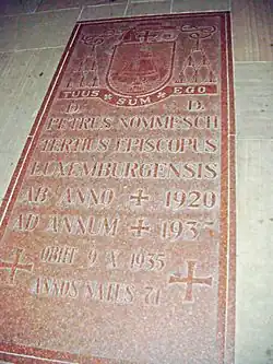 Er wurde bestattet in der damals gerade neu erbauten Krypta der Kathedrale Notre-Dame, Luxemburg, wo seine Grabplatte vor dem Hauptaltar in den Boden eingelassen ist.