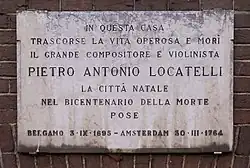 Locatellis Musik verbreitete sich abseits der von ihm beaufsichtigten Veröffentlichungen durch handschriftliche Kopien und unautorisierte Drucke.[73] Nie wurde seine Musik gänzlich vergessen, trotz einer Vernachlässigung des Komponisten vom späten 19. Jahrhundert bis zur Mitte des 20. Jahrhunderts.[74] Zu dieser nahm die musikwissenschaftliche Beschäftigung mit Locatelli ihren Anfang mit der Monographie Leven en werken van Pietro Antonio Locatelli da Bergamo, 1696–1794. „Italiaans musycqmeester tot Amsterdam“ (1949) von Arend Koole, basierend auf Archivrecherchen. Darauf baute die Dissertation The Life, Times and Works of Pietro Antonio Locatelli (1969) von John Hendrik Calmeyer auf. Der Buchhalter Giuseppe Fumagalli, Abkomme Locatellis, ließ 1964 eine Gedenktafel am Haus, in dem Locatelli starb, anbringen und gründete die Gesellschaft „Collegium Musicum Pietro Antonio Locatelli“ in Bergamo. Als deren Präsident gab er beim Musikwissenschaftler Albert Dunning die Monographie Pietro Antonio Locatelli. Der Virtuose und Seine Welt (1981) in Auftrag. Fumagalli und Dunning gründeten 1991 die Stichting-Fondazione Pietro Antonio Locatelli mit Sitzen in Amsterdam und Cremona. Diese ging 2005 in das Centro Studi Opera Omnia Luigi Boccherini in Lucca ein. Die beiden Institutionen betreuten eine kritische und eine praktische Gesamtausgabe der Werke Locatellis.[75]