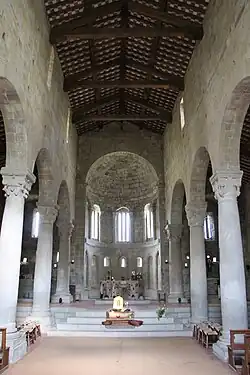 Die Kirche ist vom Typ her eine Säulenbasilika, sie verfügt dementsprechend über drei Kirchenschiffe mit erhöhtem Mittelschiff. Die Kirche verfügt über kein Querschiff, auf der Ostseite läuft das Mittelschiff in einer zweigeschossigen Apsis aus. Die letzten Achsen der Seitenschiffe sind mit Tonnengewölben gedeckt, wie auch die letzten Arkadenbögen vor der Apsis deutlich kleiner sind als die anderen. Vermutet wird, dass diese Konstruktion möglicherweise eine Art „vereinfachter Kapellenkranz“[5] darstellen sollte.