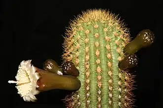 Die sich allmählich erweiternden Blüten sind 5,5 bis 7,5 Zentimeter lang und weisen Durchmesser von 2 bis 4 Zentimetern auf. Die niedergedrückt kugelförmigen Früchte erreichen Durchmesser von 3,8 Zentimetern, reißen seitlich auf und enthalten ein magentafarbenes Fruchtfleisch.