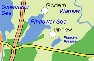 Die Ufer sind schwer zugänglich, da sehr steil und teils stark bewachsen. Im See liegen zwei Inseln namens Flakenwerder und Fischerwerder. An der Südseite liegt der namensgebende Ort Pinnow und im Nordosten der Ort Godern. In beiden Orten existieren Badestellen. Am Südufer befindet sich das Wasserwerk Pinnow, das Trinkwasser aus einem tiefen Grundwasserleiter fördert und auch Teile Schwerins versorgt.[2]