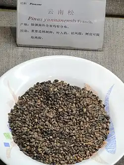 - Pinus yunnanensis var. yunnanensis bildet bis zu 30 Meter hohe Bäume mit nicht oder nur leicht hängenden, 10 bis 20 manchmal bis 30 Zentimeter langen Nadeln mit vier bis sechs Harzkanälen. Die Samenzapfen öffnen sich bei Reife und fallen nach Abgabe der Samen ab. Das Verbreitungsgebiet liegt im Süden Sichuans, in Yunnan und im Osten von Guizhou und Guangxi.[5][8]