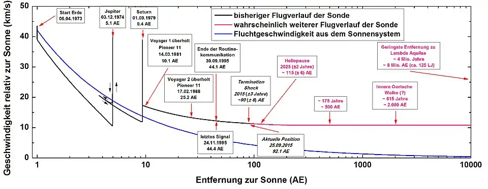 Pioneer 11 ist diejenige Sonde, die das Sonnensystem mit der geringsten Geschwindigkeit verlässt, da ihre Flugbahn nach dem Swing-by an Jupiter eine relativ große Abweichung von dessen Bewegungsrichtung haben musste. Da sie deswegen auch von beiden Voyager-Sonden überholt wurde (die zudem wie Pioneer 10 noch wesentlich länger aktiv waren bzw. sind), spielten die zwischen 1990 und 1995 gewonnenen Messergebnisse im interplanetaren Raum nur eine geringe Rolle.