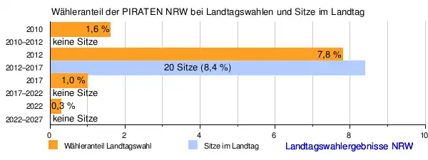 Bei der Landtagswahl 2017 scheiterten die NRW-Piraten mit nur noch 1,0 % deutlich an der Fünf-Prozent-Hürde und verpassten in der Folge den erneuten Einzug in den nordrhein-westfälischen Landtag.[7] Auch bei der Landtagswahl 2022 wurde der Einzug in den Landtag deutlich verfehlt.
