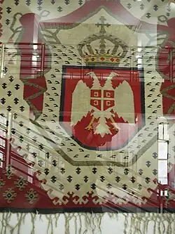 Ein symbolischer Bedeutungszuwachs erwuchs dem Piroter Kelim unter König Aleksandar Obrenović, der 1902 eine Kelim-Gesellschaft initiierte, und Königin Draga Mašin, die sich stark für die Volkstradition einsetzte und Vladislav Titelbah einen Katalog Piroter Kelime anfertigen ließ. Gleichzeitig wurde dieser zur Dekoration der Residenzen eingeführt.[28] Mit der Wiederankunft Peters I. aus seinem Exil in den mit Piroter Kelimen feierlich geschmückten Halle des Belgrader Hauptbahnhof, wurde die formelle, repräsentative Funktion vergleichbar französischer Tapisserie,[29] bei Staatszeremonien deutlich.[30] So fanden auch die Thronreden des serbischen und später jugoslawischen Königs Alexander I. im Haus der Nationalversammlung in einem festlich mit Piroter Kelimen geschmückten Plenarsaal statt.[31] Während der Einweihung der Bronze-Skulptur Dank an Frankreich am 11. November 1930 zum Gedenken an den Waffenstillstand von Compiègne war durch Aushängen von Piroter Kelimen an den Häusern Belgrads,[32] wie der mit Piroter Kelimen feierlich geschmückten königlichen Loge und dem von Kelimen umgürteten Podest des Meštrović-Denkmals diesem eine Staatsinsignien vergleichbare Rolle zugedacht.