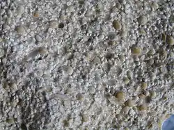 - Eine weit verbreitete Bedeutung bezeichnet ein nicht im Meer gebildetes, lagiges, relativ großes Kalk- (oder auch Nicht-Kalk-)Korn mit einem Kern.