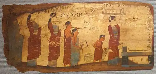 Während die 32 × 15 cm große Tafel fast komplett erhalten ist, existiert von der Malerei nur der rechte obere Teil. Man sieht sechs Frauen beim Kreisreigentanz. Ihr Kopf ist mit einem Tuch bedeckt, und sie tragen darüber goldene Kränze. Weitere Figuren sind noch als „Schatten“ auf dem Holz zu erkennen. Es gibt Beischriften, von denen jedoch nur der Name Telesoio eindeutig gelesen werden kann. Die Tafel stammt aus dem späten 6. Jahrhundert.