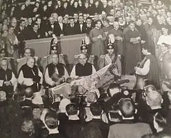 Nach seinem Tode wurde der Leichnam des Papstes in die Sixtinische Kapelle überführt und dort aufgebahrt. Seinem Wunsch entsprechend blieb er zunächst einige Stunden unter dem Gemälde Michelangelos vom Jüngsten Gericht. Am Spätnachmittag des 11. Februar folgte der prunkvolle Trauerzug in die Sakramentenkapelle des Petersdoms, wo der Leichnam für zwei Tage aufgebahrt blieb und dem Volk gezeigt wurde. Nach dem feierlichen Totenamt am 14. Februar 1939 wurde die Bahre vor dem Papstaltar aufgestellt und der Leichnam anschließend in einen dreifachen Sarg gelegt: zunächst in einen Zypressensarg, dieser in einen Bleisarg mit einem Kreuz am Kopfende, einem mittigen Totenkopf mit zwei gekreuzten Gebeinen sowie am Fußende mit einer Tafel mit den Lebensdaten des Papstes und dem Papstwappen. Dieser Bleisarg wurde schließlich von einem Ulmensarg umschlossen.