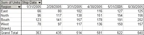 - Zeilen- und Spaltenfelder von Pivot-Tabellen entsprechen Feldern in der Group-by-Klausel.