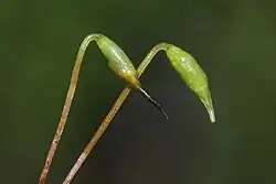 Die Geschlechterverteilung ist monözisch. Sporophyten entspringen einzeln oder zu mehreren (bis zu 6) dem Sprösschenende. Die Seta ist 2 bis 4 Zentimeter lang, unten purpurn, oben gelb. Die zylindrische bis lang ellipsoidische Kapsel ist nickend bis hängend, der Kapseldeckel lang geschnäbelt. Sporen sind gelblich-bräunlich, papillös und 18 bis 30 Mikrometer groß.