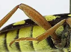 Die Beine sind rotbraun und robuster als bei den Arten der Gattung Clytus, die Schenkel oft angedunkelt. Mittel- und Hinterschenkel sind auf der Unterseite nicht lang abstehend behaart wie bei verwandten Arten (Abb. 4). Die fünfgliedrigen Tarsen erscheinen viergliedrig, da das vierte Glied sehr klein und zwischen den Lappen des dritten Gliedes versteckt ist.