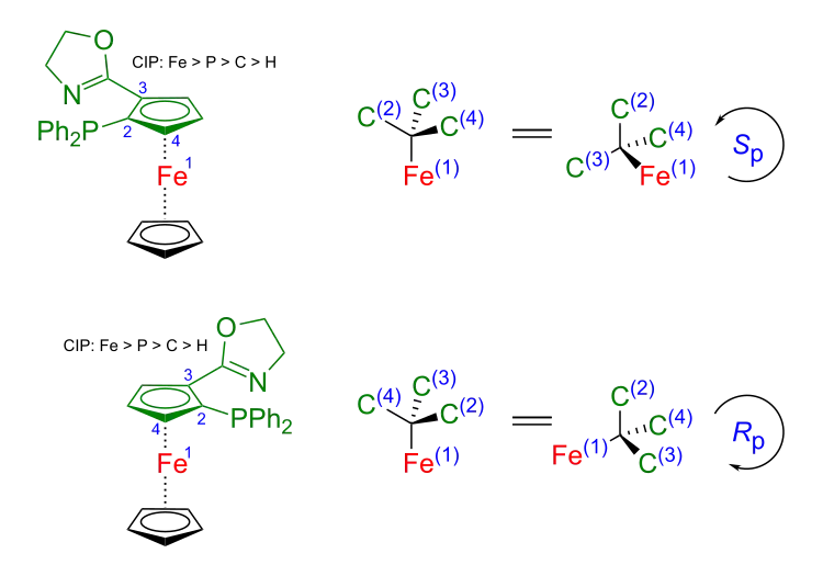 Auch in Aren-Komplexen wie z. B. Derivaten des Ferrocens kann planare Chiralität auftreten.[9][10] Die Chiralitätsebene liegt in diesem Fall in der Ebene des planaren Aren-Liganden. Die planare Chiralität ist das Resultat unterschiedlicher Anordnung der Substituenten im Aren-Liganden. Zur Bestimmung der Chiralität geht man in diesem Fall wie folgt vor: