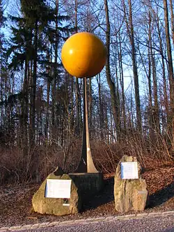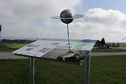 Buchenberg: Planeten-Rundweg in der Eschacher Wanderregion[15]; Entfernungsmaßstab und Planetenmaßstab 1:600 Mio., beginnend am Parkplatz Eschacher Weiher (47° 42′ 1,9″ N, 10° 11′ 25,5″ O47.70051610.190405)Saturnstation des CvL-Planetenwegs in der Eschacher Wanderregion