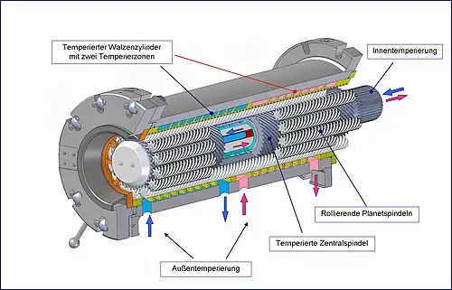 Beim Planetwalzenextruder wird eine Zentralspindel angetrieben, auf welcher sich die einzelnen, in ihrer Zahl variierbaren Planetspindeln, abwälzen. Die umlaufenden Planetspindeln werden zusätzlich über eine innenverzahnte Buchse (Walzenzylinder) geführt. Die Temperierung erfolgt sowohl über die Zentralspindel als auch über den Walzenzylinder. Die Planetspindeln erfassen beim Umlaufen der Zentralspindel das Material und durch das Eintauchen der Spindelzähne in die korrespondierenden Zahnlücken wird das eingegebene Material zu dünnen Schichten ausgewalzt und mittels der Drallverzahnung nach vorne transportiert. Die wiederholte Dünnschichtauswalzung mit den Planetspindeln und die große wärmetauschende Oberfläche des dünnwandigen Walzenzylinders gewährleisten eine optimale Plastifizierung, Dispergierung und Homogenisierung.