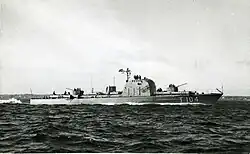 - ↑ 1956 vom Stapel gelaufen, 1977 ausgemustert und zusammen mit Antares (T109) an einen privaten Interessenten verkauft.