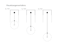 und beträgt bei üblichen PKW-Motoren zwischen 0,28 und 0,33. Die Pleuellänge ist der Abstand der Pleuelaugenmitten (Lagerachsen). Je höher , desto größer die Kolbenseitenkräfte. Bei Kolbenmotoren mit Kreuzkopf wird in der Regel höher gewählt, da die Seitenkräfte vom Kreuzkopf abgestützt werden. Je höher , desto geringer die Pleuelmasse (oszillierende Masse) bei gleicher Festigkeit des Pleuels. Ein niedrigeres bei gleichem Kolbenhub führt zu einer steigenden Bauhöhe des Motors.