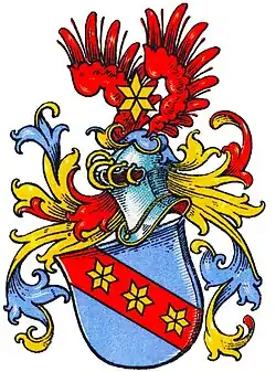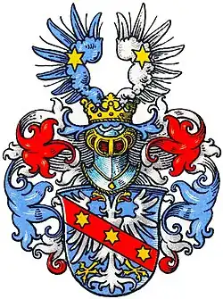 Das Stammwappen zeigt in Blau[1] einen mit drei goldenen Sternen belegten roten Schrägrechtsbalken. Auf dem Helm mit rot-goldenen Decken ein silberner Stern zwischen offenem roten Flug.