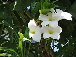 Die wachsigen, duftenden, zwittrigen, radiärsymmetrischen Blüten sind fünfzählig. Die fünf verwachsenen Kelchblätter sind kurz mit gleich- oder verschiedengestaltigen Kelchlappen und besitzen keine Drüsen.[1] Die fünf Kronblätter sind schüssel- bis trichterförmig verwachsen. Die innen behaarte, schmale Kronröhre endet in fünf ausgebreiteten Kronlappen, die sich im Uhrzeigersinn überlappen. Die Farben der Kronblätter reichen von weiß bis gelb und von hell- bis dunkelrosa. Wenn ein Diskus vorhanden ist, dann ist er fleischig. Es ist nur ein Kreis mit fünf fertilen Staubblättern vorhanden; sie sind mit der Basis der Kronröhre, aber nicht mit dem Stempel verwachsen. Die zwei Fruchtknoten sind halbunterständig mit vielen mehrreihig angeordneten Samenanlagen. Der kurze Griffel endet in einer zweispaltigen Narbe.[1]