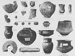 Unmittelbar südlich der bronzezeitlichen Steinkiste IV-V (siehe unten) wurde eine größere Ansammlung Scherben gefunden. Einige wiesen ein Zickzackmuster auf. Sie gehörten zu einer bauchigen Amphore mit einer Höhe von 24 cm und einem maximalen Durchmesser von 26 cm. Sie besaß vier Ösen, zwischen denen ein Band aus Zickzacklinien verlief. Ein schmalerers Zickzackband verlief am Hals-Schulter-Umbruch. Weitere Bänder verliefen zwischen diesem und den Ösen. Andere Scherben wiesen Schnurverzierungen auf. Aus diesen Gefäßen konnte Höfer einen Becher mit relativ kurzem Hals zusammensetzen. Er hatte eine Gesamthöhe von 17 cm, wobei 10 cm auf den Bauch und 7 cm auf den Hals entfielen. Der Bodendurchmesser betrug 7 cm, der Mündungsdurchmesser, der zugleich der maximale Durchmesser war, 11,5 cm.[13]