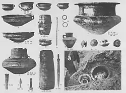 Diese bestand aus vier Keramikgefäßen sowie drei bronzenen Lanzenspitzen. Bei dem größten der Gefäße handelt es sich um eine bauchige Terrine mit scharfem Umbruch und ausladendem Rand, die in der östlichen Hälfte der Kiste stand. Sie hatte eine Höhe von 27 cm und einen maximalen Durchmesser von 52 cm. Als Dekor weist sie am Bauch vier Buckel mit konzentrischen Halbkreisen und zwischen den Buckeln jeweils acht senkrechte Hohlkehlen auf. Im Inneren der Terrine fand sich ein unverzierter, flacher Teller. Westlich neben der Terrine stand eine bauchige Amphore mit konischem Hals und zwei Ösen am Hals-Schulter-Umbruch. Sie hatte eine Höhe von 26,5 cm, einen maximalen Durchmesser von 35 cm und einen Mündungsdurchmesser von 16 cm. Die Verzierung besteht aus acht horizontalen Hohlkehlen, welche die gesamte Schulter des Gefäßes einnehmen. Auch die Amphore enthielt noch ein weiteres Gefäß. Bei diesem handelte es sich um eine flache, zweigliedrige Tasse mit einer umlaufenden Verzierung aus senkrechten Kanneluren am Bauch. Die Lanzenspitzen wurden nicht im Inneren der Kiste gefunden, da sie ursprünglich sicherlich hölzerne Schäfte besessen hatten, die für diese zu lang waren. Sie wurden an der östlichen Außenseite der Kiste gefunden und waren mit Steinen bedeckt. Ihre Spitzen zeigten nach Süden. Alle drei Spitzen waren von ähnlicher Machart aber von unterschiedlicher Größe. Sie besaßen sich verjüngende Tüllen, die fast bis zur Spitze reichten, sowie zwei Nietlöcher am unteren Ende. Die größte Lanzenspitze hatte eine Länge von 15,2 cm, die mittlere eine Länge von 10,5 cm und die kleinste eine Länge von 8,2 cm.[22]