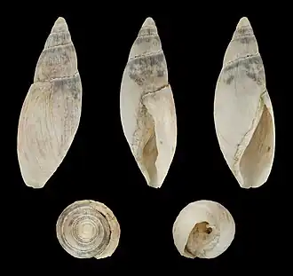 Das rechtsgewundene, spindelförmige, mit feinen Zuwachsstreifen versehene Gehäuse wird beim erwachsenen Tier etwa 2,5 bis 3,8 cm lang und erreicht einen Durchmesser von etwa 0,8 bis 1,2 cm, womit es schlanker als bei anderen Arten der Gattung ist. Die Gehäusemündung ist mit einer Breite von etwa 5 mm bis 7 mm relativ schmal. Die Spindel ist stets gerade. Die Oberfläche des Gehäuses ist weiß mit gelblicher Schattierung.