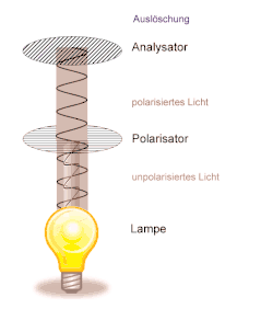 - Optisch anisotrope Materialien sind so strukturiert, dass das Licht in ihnen nur in zwei aufeinander senkrecht stehenden Richtungen schwingen kann. Liegt eine dieser Richtungen parallel zur Polarisationsrichtung des anregenden Lichtes (auch Normalstellung genannt), so bleibt die Schwingungsrichtung beim Durchstrahlen der Probe erhalten. Daher wird das Licht vom Analysatorfilter vollständig blockiert. Für jeden anisotropen Kristall gibt es durch Drehung genau vier Orientierungen mit Auslöschung, die alle senkrecht aufeinander stehen.